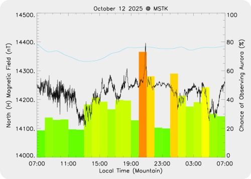 This website provides a real-time monitor of geomagnetic activity in the Edmonton area (though larger activity can be seen Alberta-wide). Join over 100,000 people using our free email alert service to know if there may be aurora visible tonight. The current probability of witnessing an aurora tonight is: