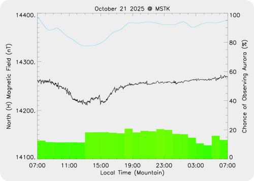 This website provides a real-time monitor of geomagnetic activity in the Edmonton area (though larger activity can be seen Alberta-wide). Join over 100,000 people using our free email alert service to know if there may be aurora visible tonight. The current probability of witnessing an aurora tonight is: