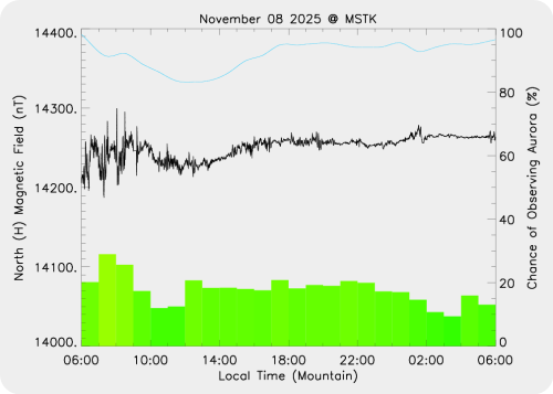 This website provides a real-time monitor of geomagnetic activity in the Edmonton area (though larger activity can be seen Alberta-wide). Join over 100,000 people using our free email alert service to know if there may be aurora visible tonight. The current probability of witnessing an aurora tonight is: