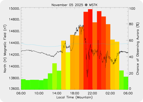 This website provides a real-time monitor of geomagnetic activity in the Edmonton area (though larger activity can be seen Alberta-wide). Join over 100,000 people using our free email alert service to know if there may be aurora visible tonight. The current probability of witnessing an aurora tonight is:
